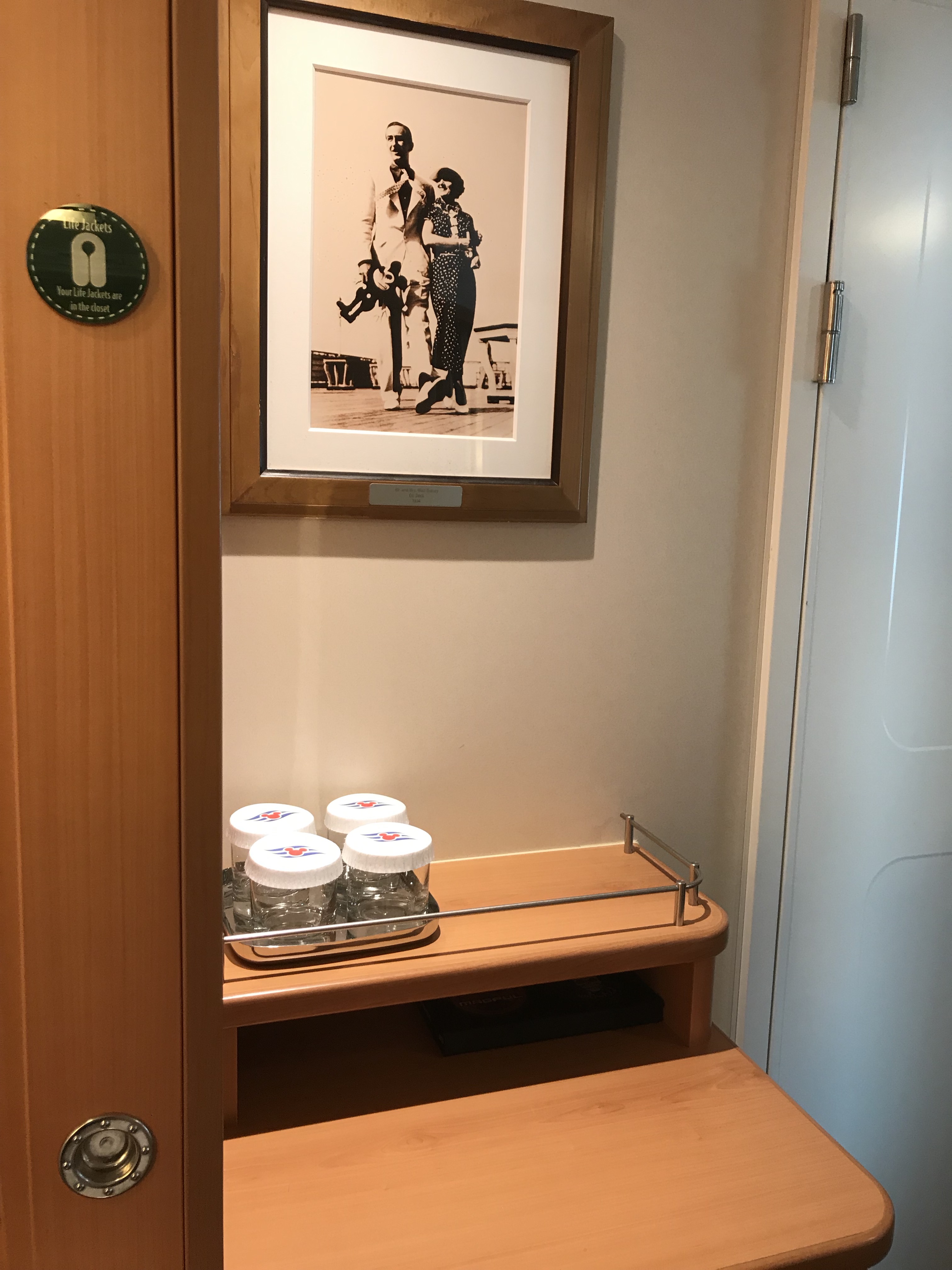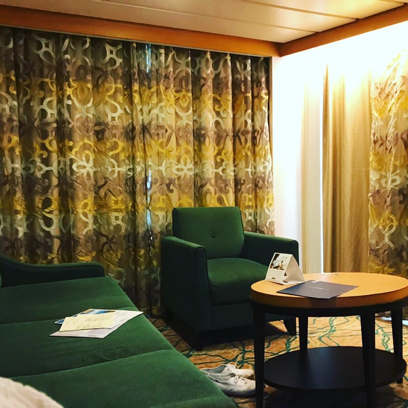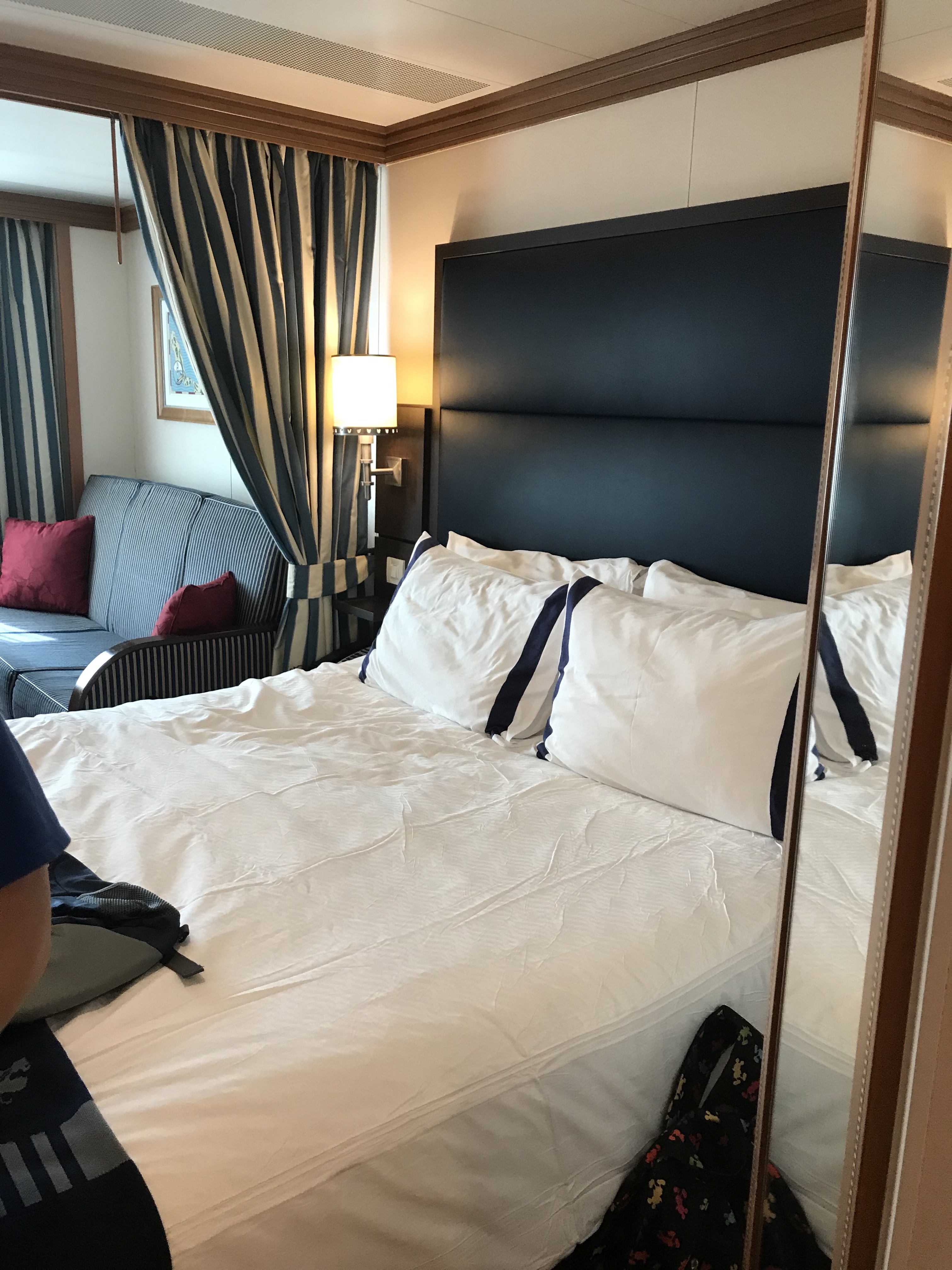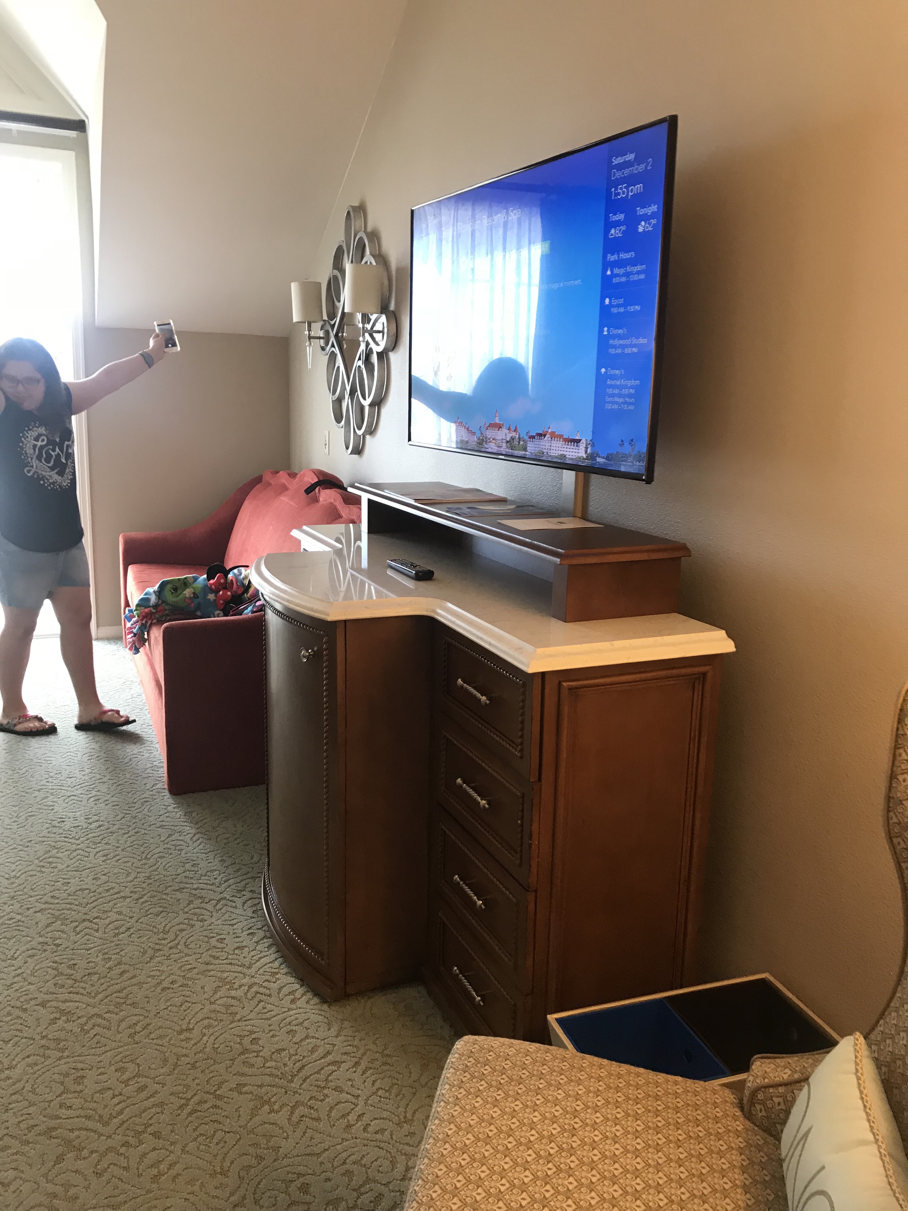 We had a Garden View Room and it was located a couple buildings away from the Main building. It was a beautiful entry with lovely furniture and mirrors as you walk in, the welcome scents are amazing and inviting. Our room was very spacious, had 2 Queen beds with luxurious bedding, a couch that made into a night time bed, a large double sided closet, a laundry bag is available for laundry service at an additional charge if you wish, a mini fridge, tv with a lot of drawers for storage, a vanity with stool and a Keurig coffee maker and K cup coffee, a large double bathroom, the one part of the bathroom was a double sink area that had a large mirror and amenities of different Disney H20 Spa products. A blow dryer is provided in the bathroom dressing area as well. The other part of the bathroom was the private room of the toilet and shower. Below I have provided photos of our room. The balcony had a small table and 2 chairs.